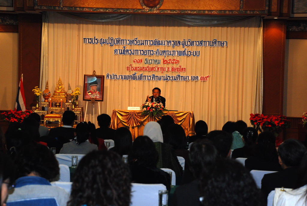 ดร.สมเกียรติ บุญรอด ผู้อำนวยการสำนักงานเขตพื้นที่การศึกษามัธยมศึกษา เขต 39 เป็นประธานเปิดการประชุมปฏิบัติการเตรียมการพัฒนาครูและผู้บริหารสถานศึกษา ตามโครงการยกระดับคุณภาพทั้งระบบ ในการอบรมครั้งนี้มีผู้บริหารและครูทุกกลุ่มสาระเข้าร่วมถึง 39 โรงเรียน ณ โรงแรมอมรินทร์ลากูน อ.เมือง จ.พิษณุโลก เมื่อวันที่ 17 ธันวาคม 2553 |